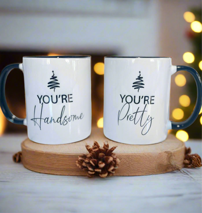 2 mugs, one reading “you’re handsome” and one reading “you’re pretty”