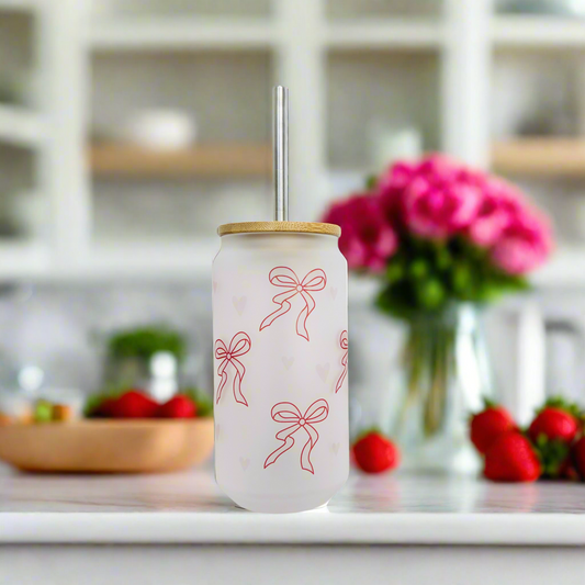 Strawberry and Bows Frosted Glass Can 18oz Tumbler