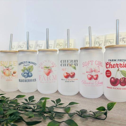 Glass Can Vintage Fruits Bamboo Lid / Metal Straw 18oz Tumbler