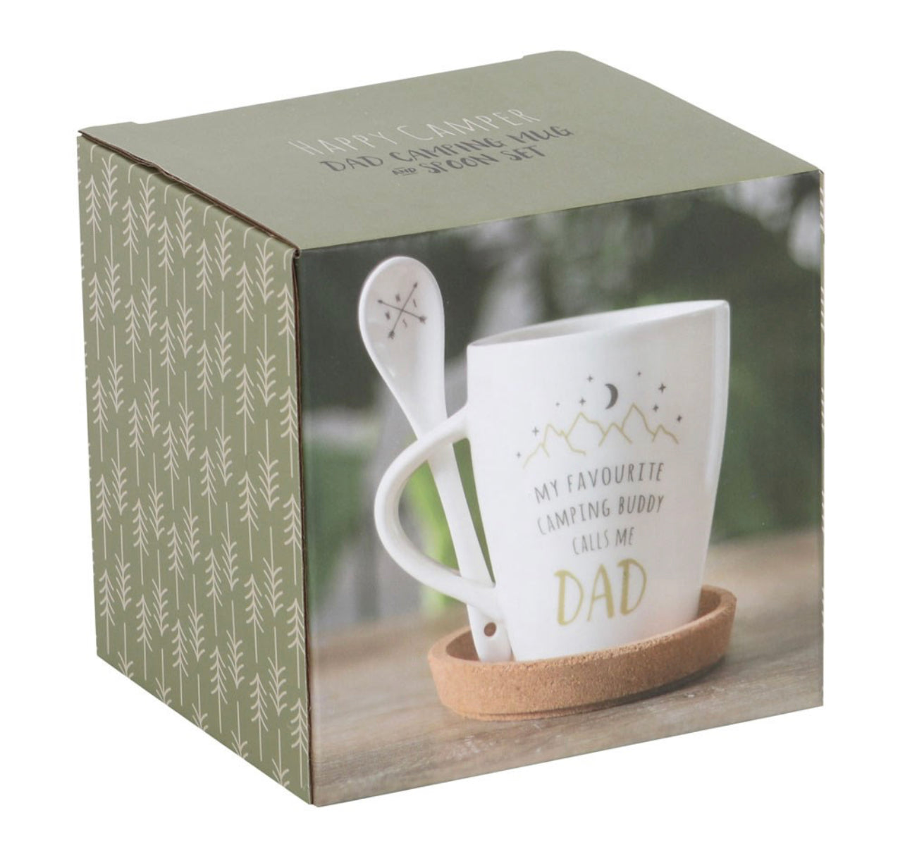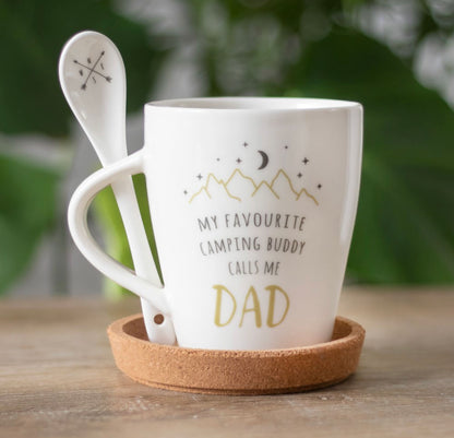A sweet mug and spoon set made just for Dad. Features a starry mountain sky design with 'My favourite camping buddy calls me dad' text, making it perfect for Father's Day and birthdays. Includes a matching teaspoon with a compass design that fits perfectly in a slotted handle. 500ml capacity. Dishwasher and microwave safe