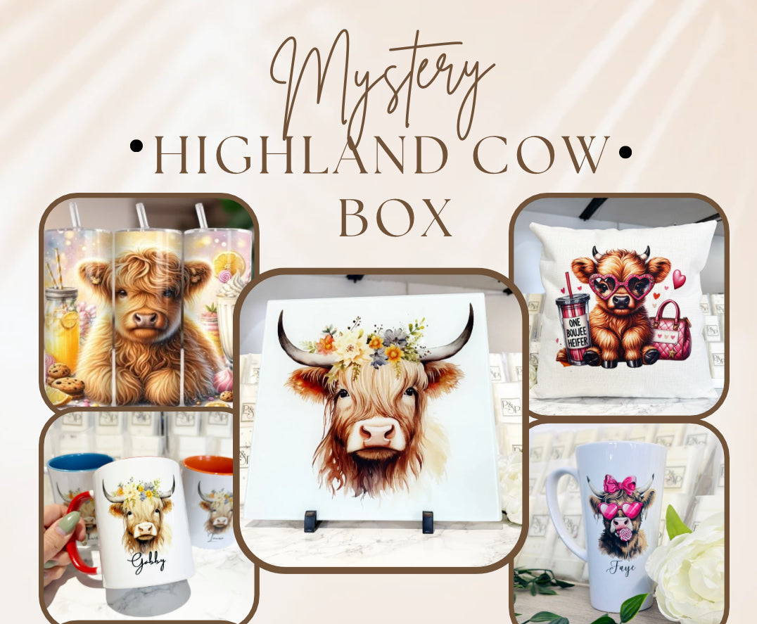 These items are made with different highland cow designs from across the website. If you do not think you would like a mystery please do not buy! You get a complete random design on each of the products stated!