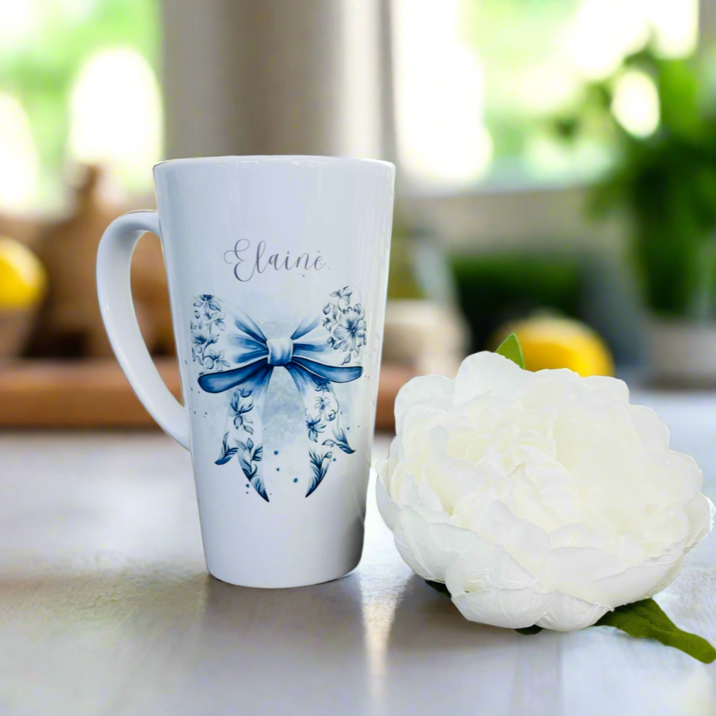 New Latte Ceramic Mug 17oz Blue Vintage Bow inc Box