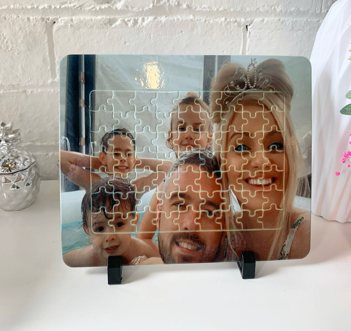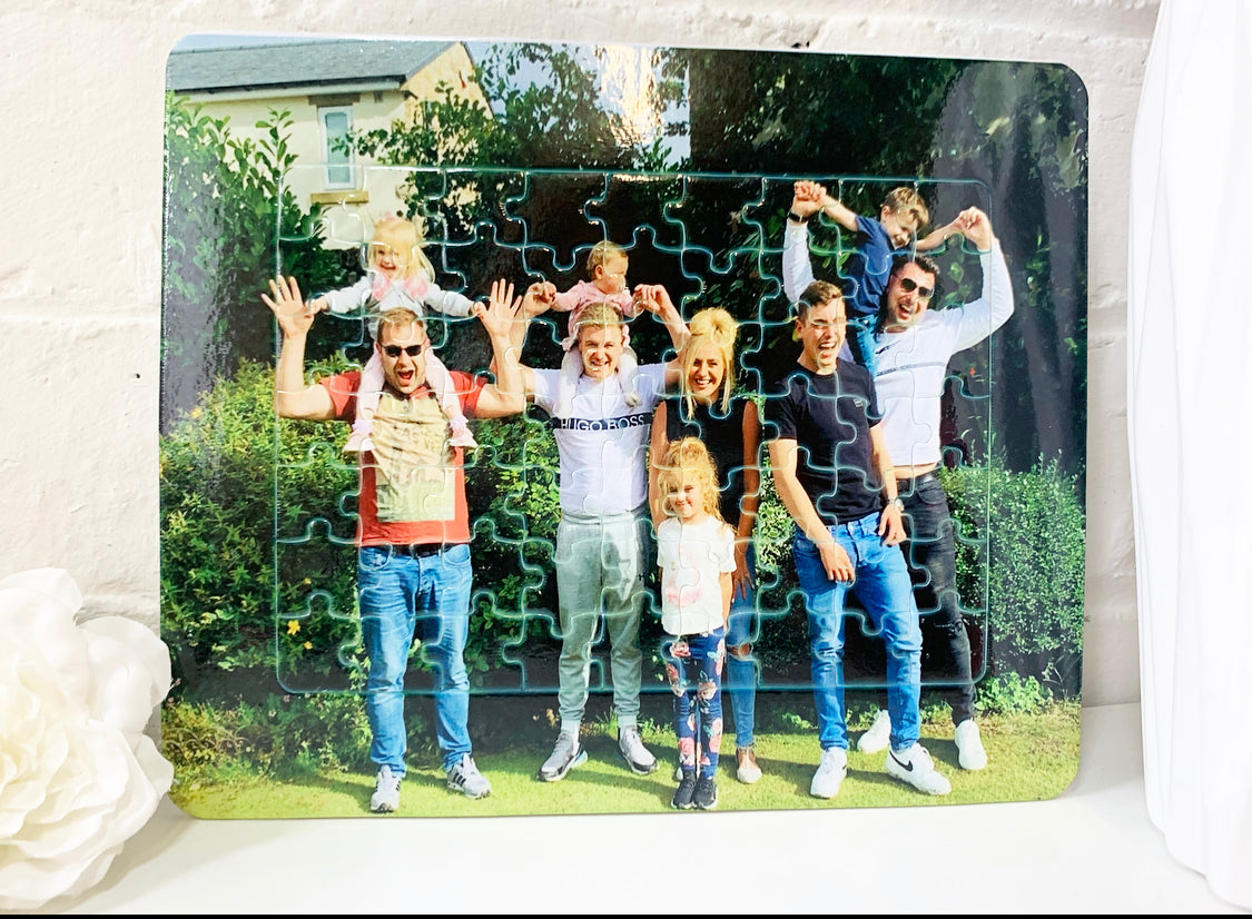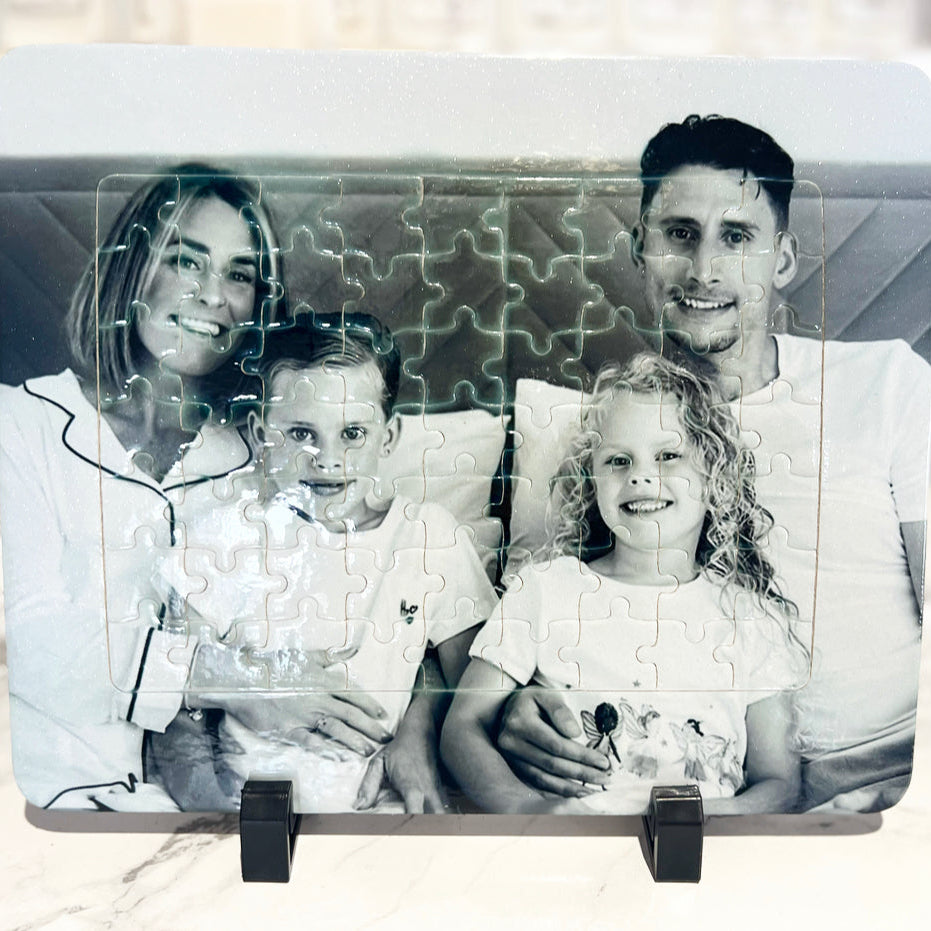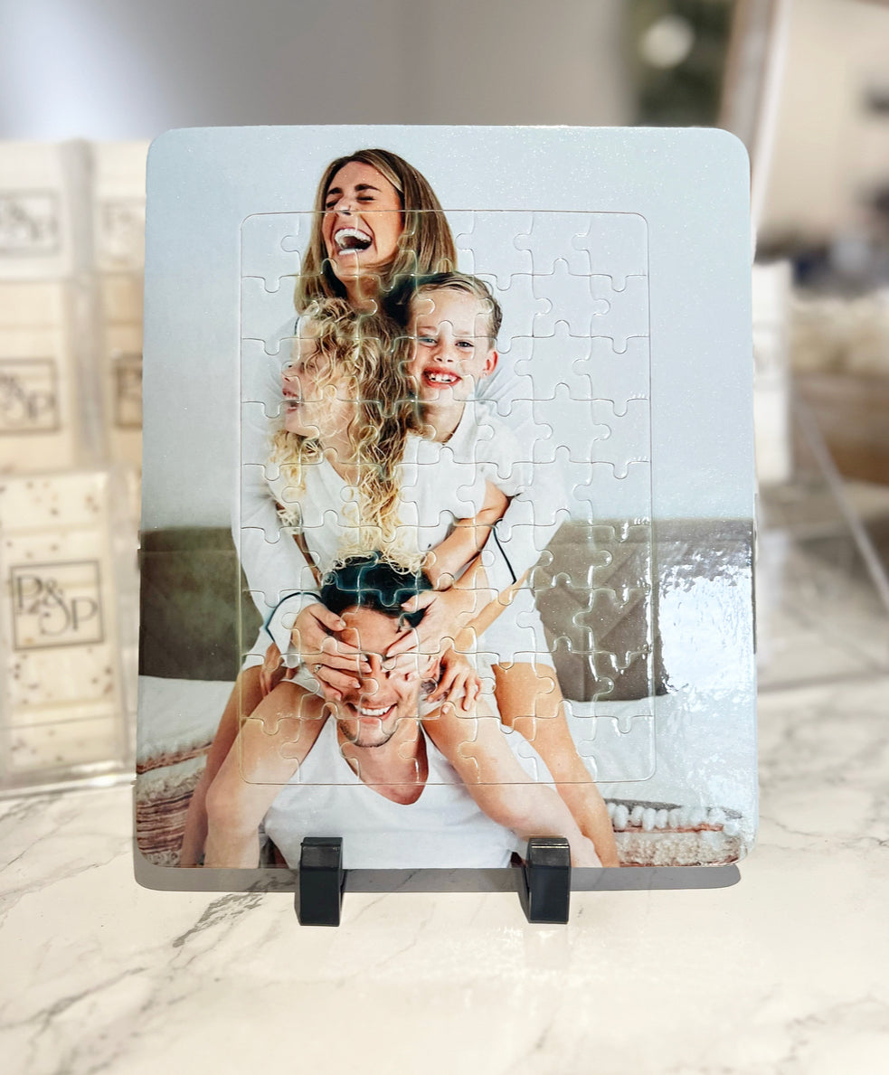 jigsaw is usually best for a landscape image as the stand at the back is for a landscape photo. If you upload a portrait photo and this cannot be cropped to landscape we will be left no choice but to add this portrait ( which means you cannot use the stand at the back) you can however purchase “slate feet” to hold your jigsaw upright as a photo of you wish to do so.