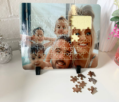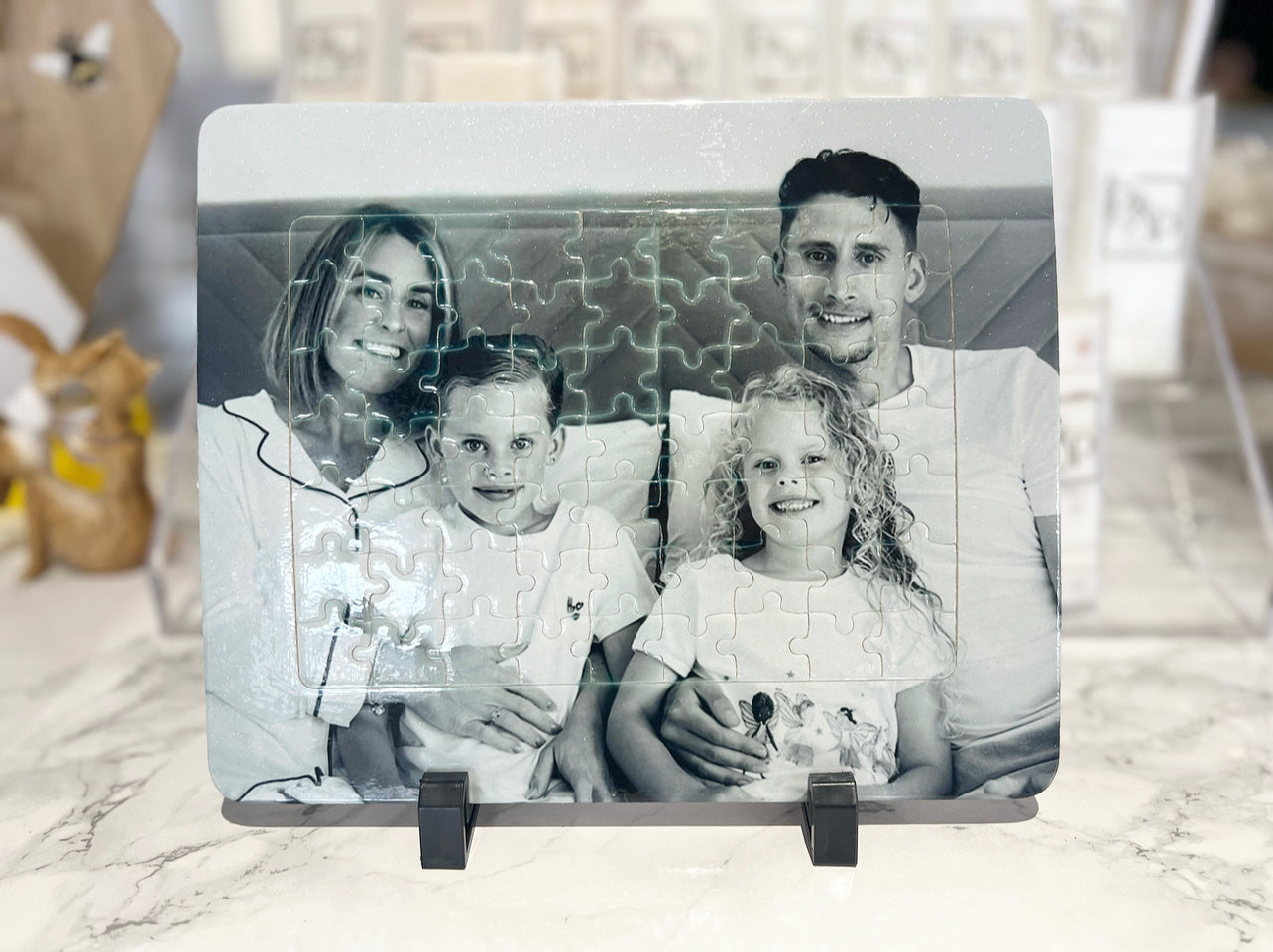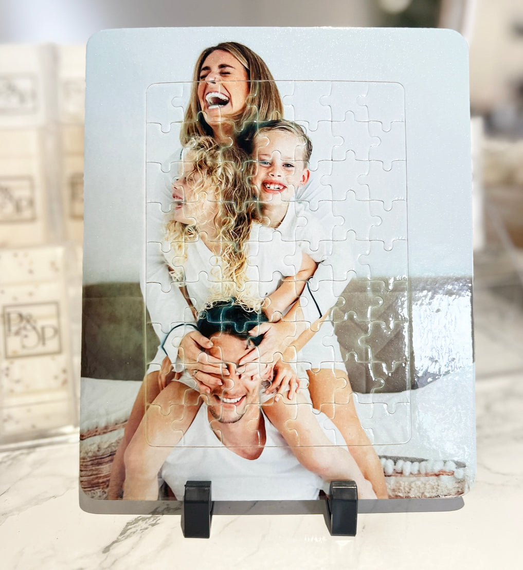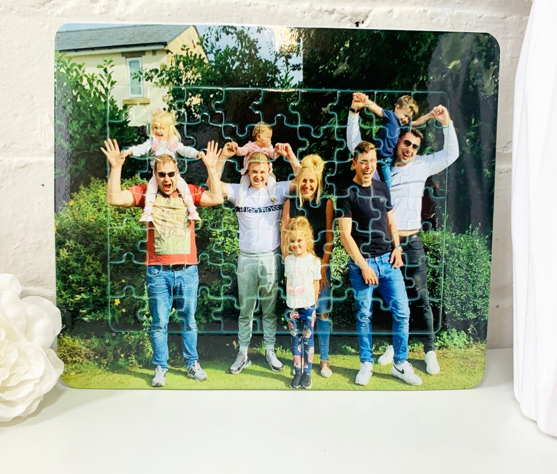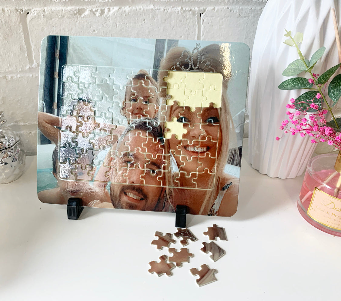 jigsaw is usually best for a landscape image as the stand at the back is for a landscape photo. If you upload a portrait photo and this cannot be cropped to landscape we will be left no choice but to add this portrait ( which means you cannot use the stand at the back) you can however purchase “slate feet” to hold your jigsaw upright as a photo of you wish to do so.