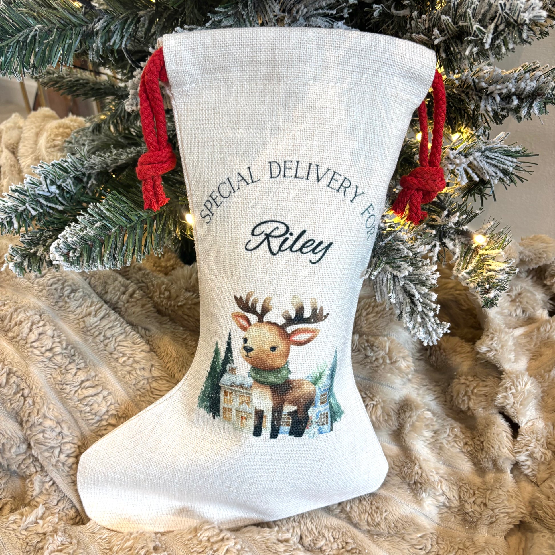 A large, drawstring Santa Sack made from a polyester blend, linen-like material.